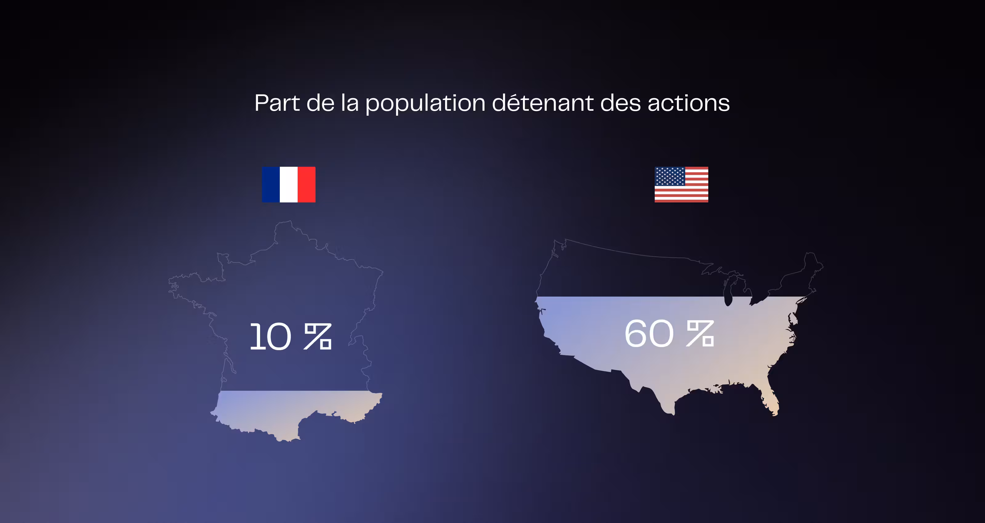Le marché boursier donne le pouls de l'économie réelle. C'est là que l'innovation rencontre la propriété, où les épargnants deviennent actionnaires des plus grandes entreprises du monde. Sur les 100 dernières années, l'indice phare américain, le S&P 500, a délivré un rendement annuel moyen de 10 %*. Le potentiel de création de richesse est immense, et pourtant, la majorité des épargnants français n'y accèdent pas : moins de 10 %* détiennent des actions. Aux États-Unis, plus de 60 %* en possèdent.