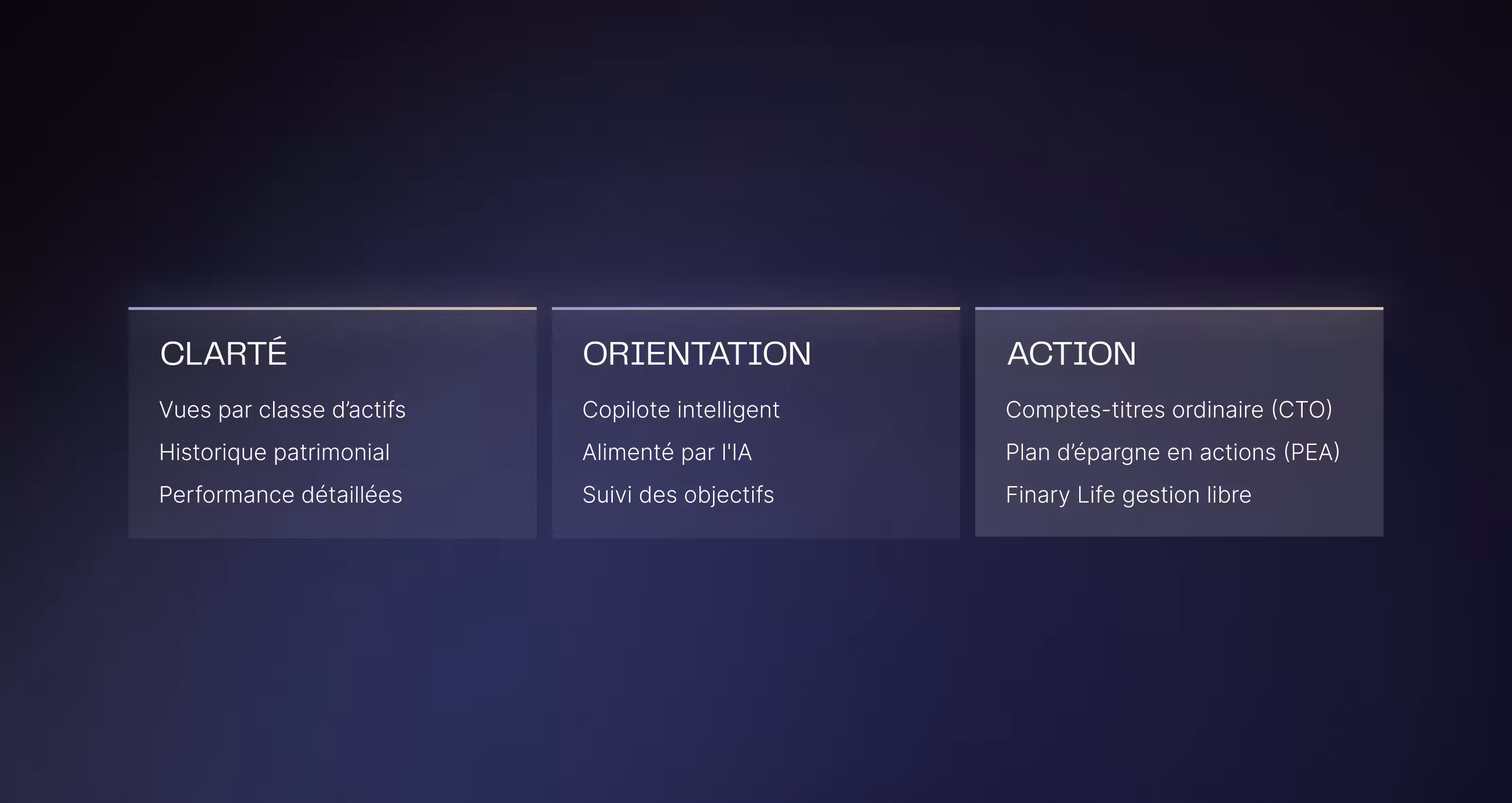 Mais un compte-titres et un PEA de plus ne suffisent pas. Le monde a changé. L'intelligence artificielle transforme chaque industrie, et la finance ne fait pas exception. Chez Finary, nous construisons un investissement augmenté par l'IA : des portefeuilles intelligents, un investissement programmé qui s'adapte à votre situation, et des recommandations personnalisées basées sur l'ensemble de votre patrimoine. Pas un robo-advisor générique. Un copilote financier qui vous connaît.