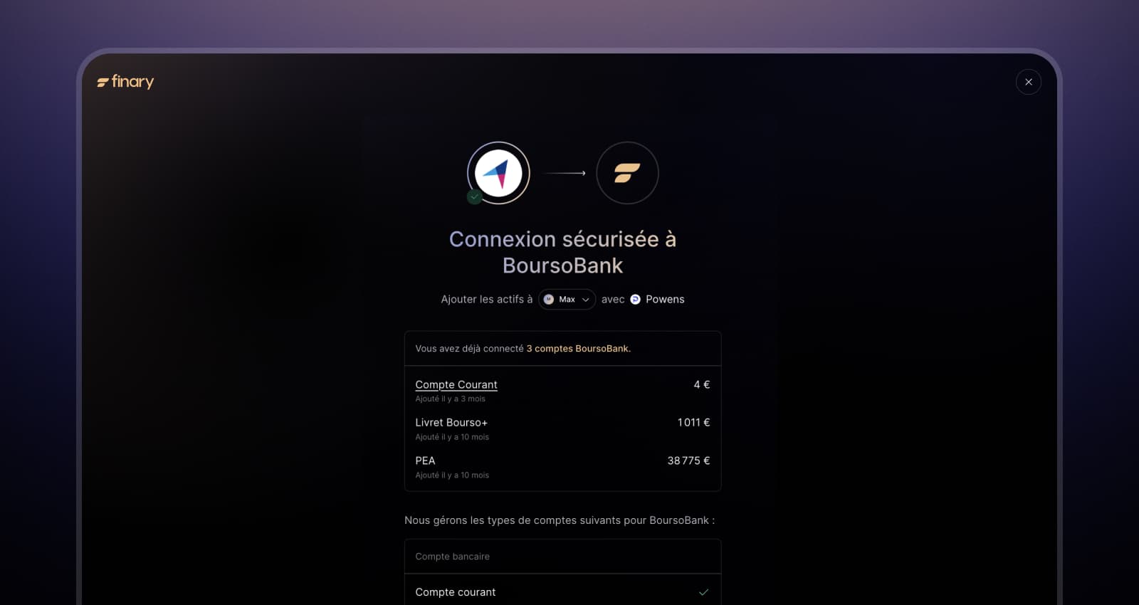 La gestion des connexions gagne en clarté. Les comptes déjà synchronisés sont mis en avant lors de l'ajout d'un établissement, avec une possible redirection directe vers les comptes existants - pour éviter les doublons qui pouvaient fausser vos données.