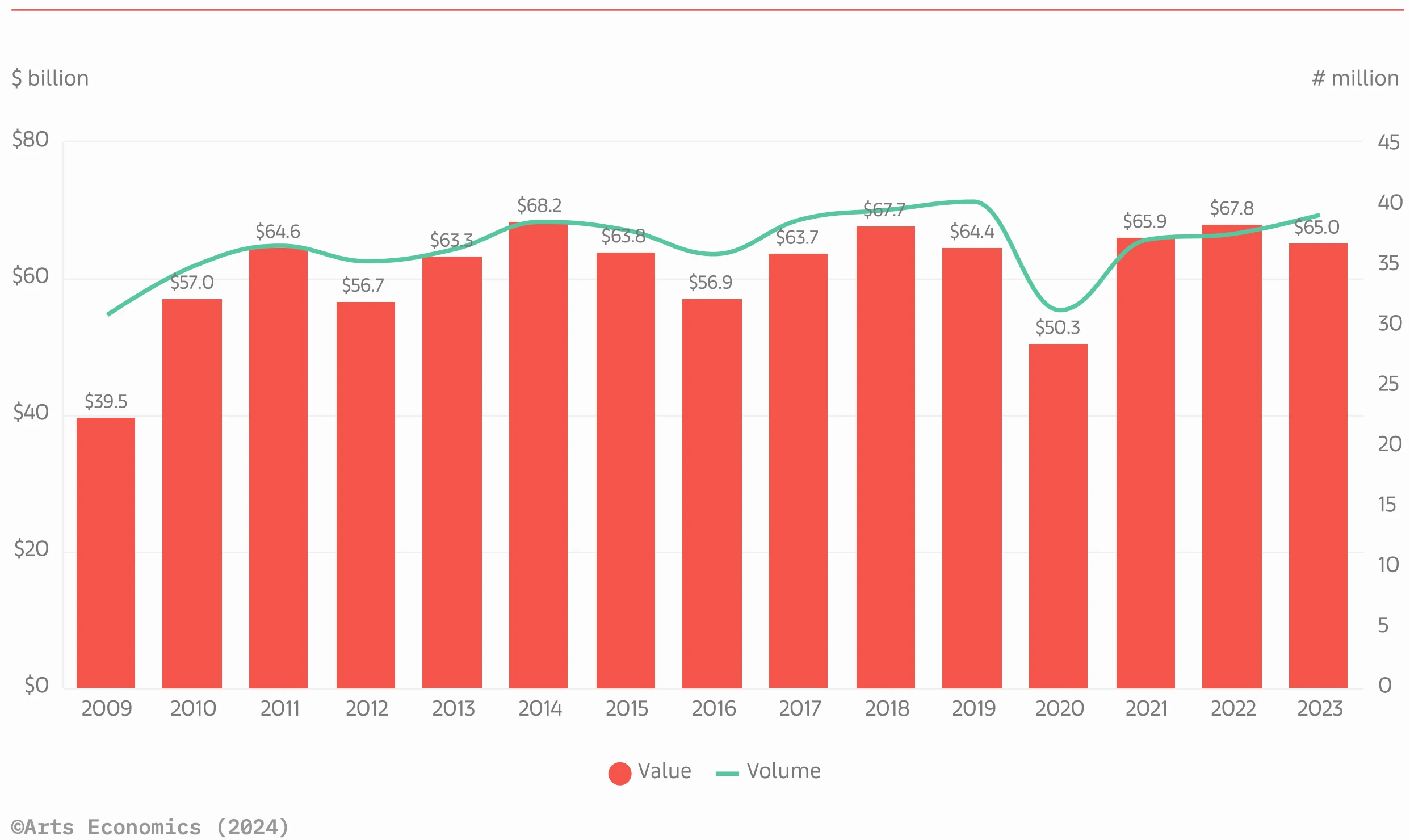 En 2023, selon le rapport selon le rapport Art Market 2024 d’Art Basel/UBS, les ventes mondiales d'art ont diminué de 4 % pour atteindre environ 65 milliards de dollars, malgré une conjoncture marquée par l'augmentation des taux d'intérêt, une inflation persistante et des instabilités politiques. La Chine a dépassé le Royaume-Uni, devenant ainsi le deuxième marché de l'art mondial avec 19 % des ventes, tandis que le Royaume-Uni est tombé à 17 %. Les États-Unis conservent leur leadership avec 42 % des ventes mondiales, bien que les ventes aient diminué de 10 %.
